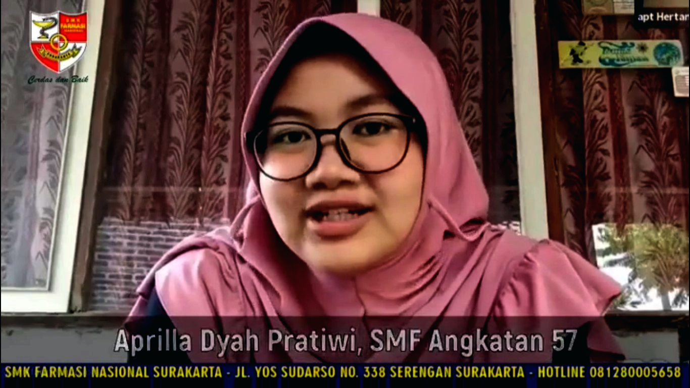 "Merupakan keputusan yang tidak kusesali bersekolah di SMK Farmasi Nasional Surakarta, karena di sini saya mendapatkan ilmu serta pengalaman yang sangat berharga. Dan akhirnya saya dapat menempuh kuliah S1 Farmasi Universitas Diponegoro."